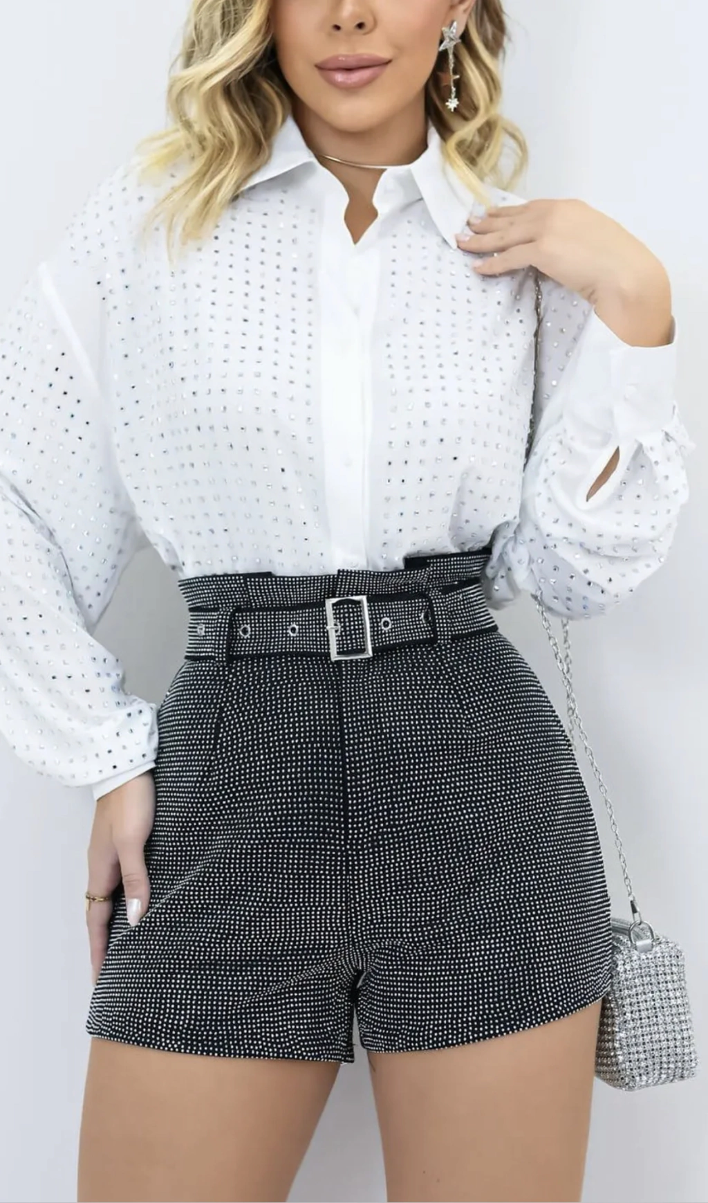O Short com aplicação de strass, apresenta um design exclusivo que combina perfeitamente elementos clássicos e contemporâneos. Com um corte impecável, detalhes cuidadosamente elaborados e acabamento de alta qualidade, este Short chama a atenção e cria uma silhueta deslumbrante. Crie looks super fashion e chic com essa peça coringa!