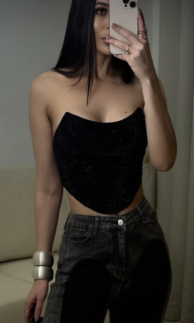 Descubra o charme sofisticado do Top Cropped Corset Tomara que Caia com Aplicação de Cristais, a peça perfeita para quem busca elegância com um toque de brilho exclusivo. Seu design estruturado valoriza a silhueta, enquanto o acabamento tomara que caia proporciona um visual moderno e delicado.