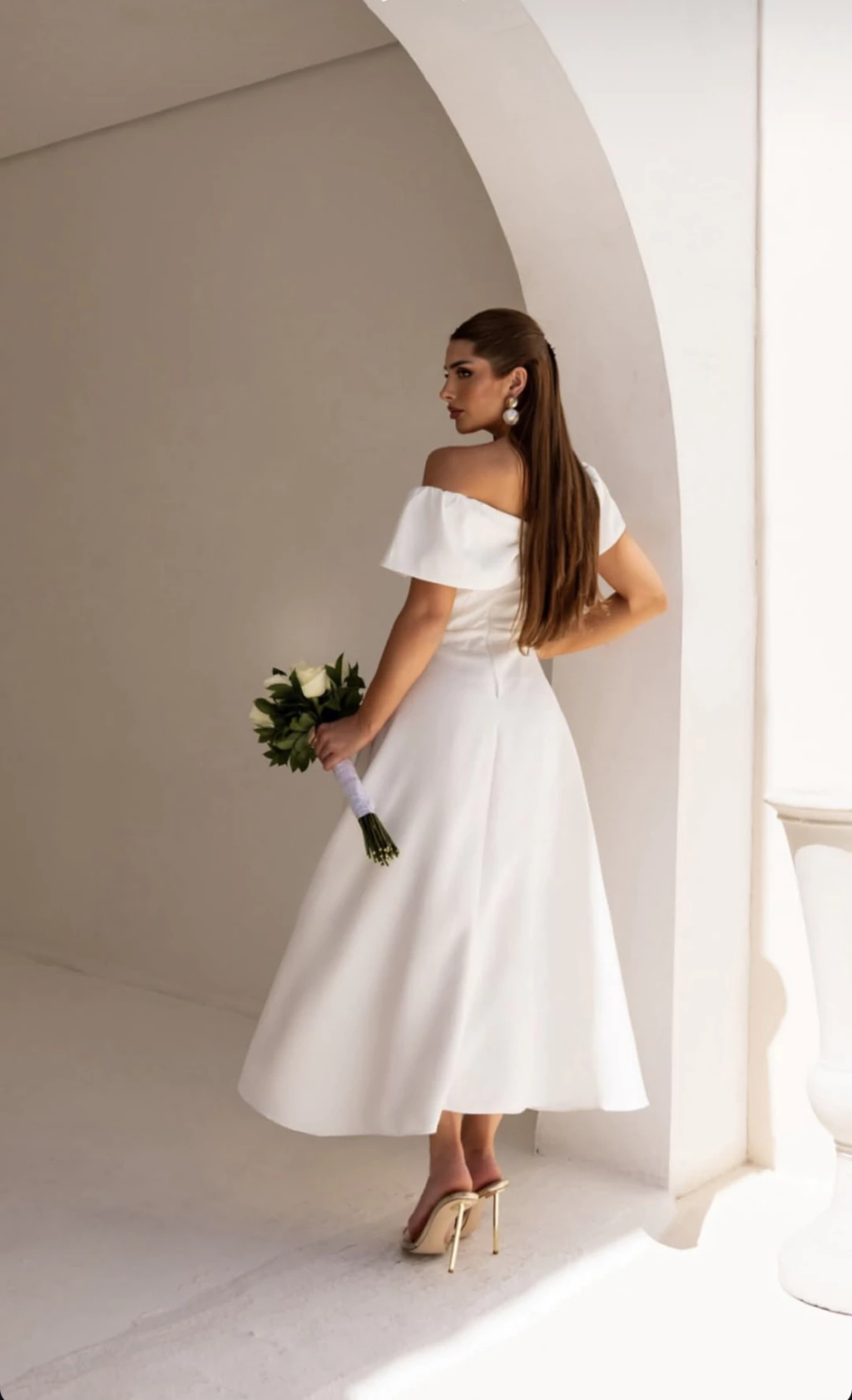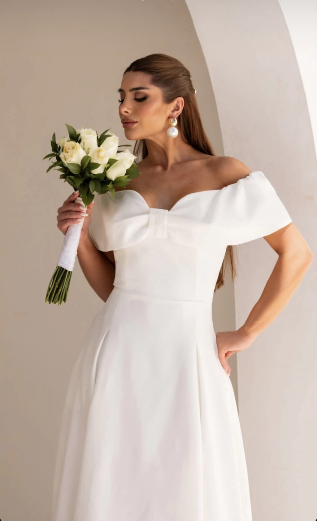 Descubra a elegância do Vestido Midi de Noiva Ombro a Ombro Laço, a escolha perfeita para noivas que desejam um toque de delicadeza e sofisticação em seu grande dia.